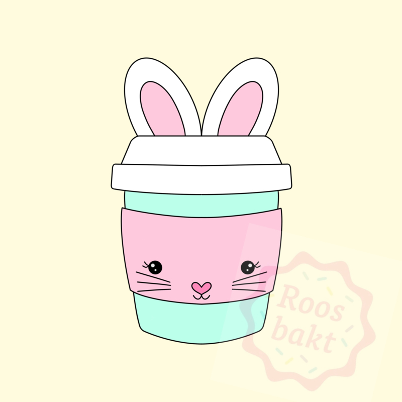Coffee to go mollig met konijnen oren uitsteker 7, 9 of 11cmDit leuke konijntje kun je op 2 manieren decoreren. Te bestellen mét of zonder "vrolijk pasen" stencil.